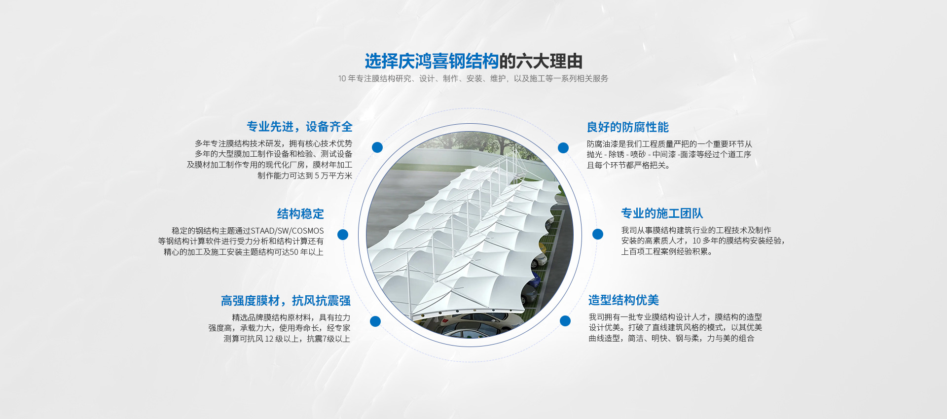 ????????安徽省慶鴻喜鋼結構有限公司是一家專業從事膜結構工程的綜合性公司。公司秉承“信譽第一、質量第一”的宗旨。開拓、發展、創新的理念。目前公司主營膜結構設計、膜裁剪設計、膜材加工及鋼結構安裝與維修。公司擁有一批國內較早從事膜結構行業的高素質技術人員和安裝隊伍,擁有先進的鋼膜設計軟件3D3S、forten32、和FSCAD,在設計上大膽創新,在加工上精益求精,在施工上安全認證,在售后上讓客戶使用放心。